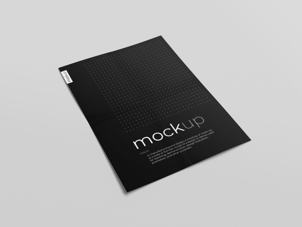 1 Scene from the Creased Paper Mockup that is a set of 9 perspectives for presenting your A3, A4 or any similar format design. All perspectives were modeled and rendered with physically correct dimensions and light setup. Mockup is highly editable. Shadows, objects, textures and ambient lights are separated.