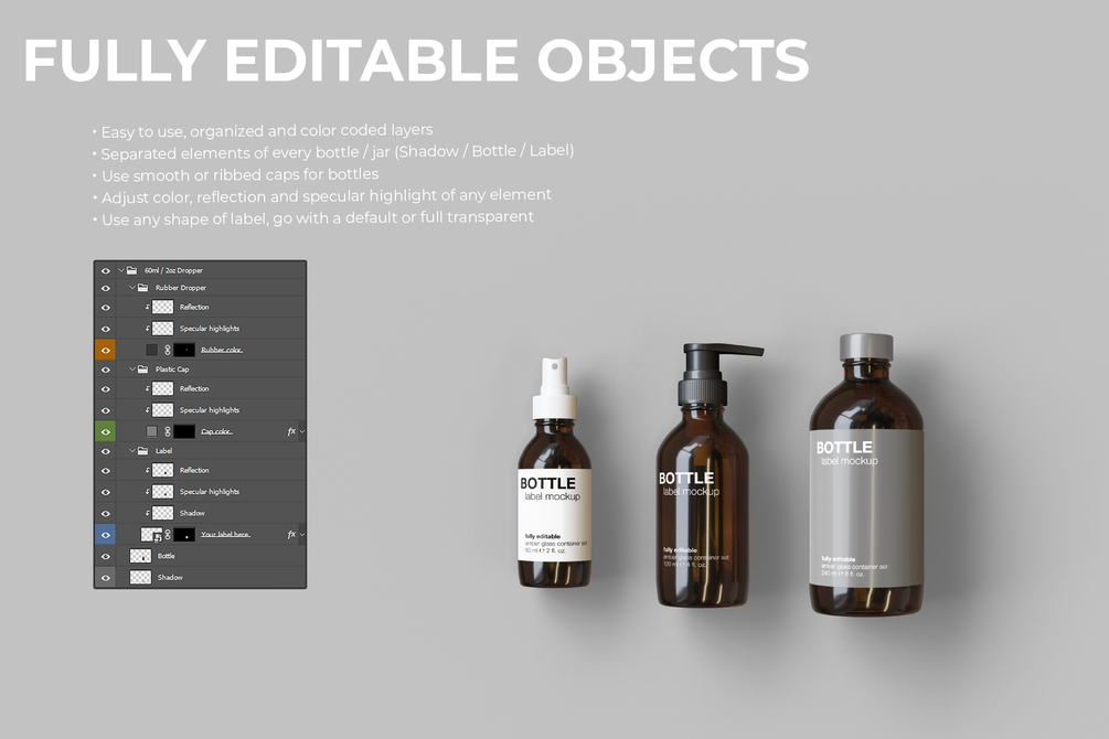 All bottles, jars, plastic and rubber elements were made specifically for this project. All elements and light setups are physically correct and assembled with much care for detail. All layers are organized, everything is named, color coded and grouped for ease of use. Package also features an Instructions manual that will help you with any technical questions you may have, and if that is not enough, you can always contact me here or via contact info provided in the manual.